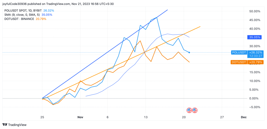 Polkadot’s native cryptocurrency, DOT, and Polygon’s native crypto token, MATIC, showcased positive momentum.